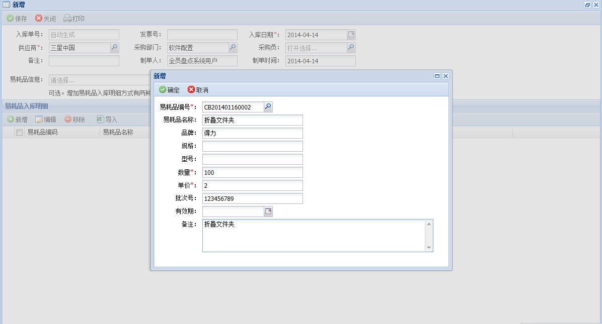 3、易耗品入庫管理